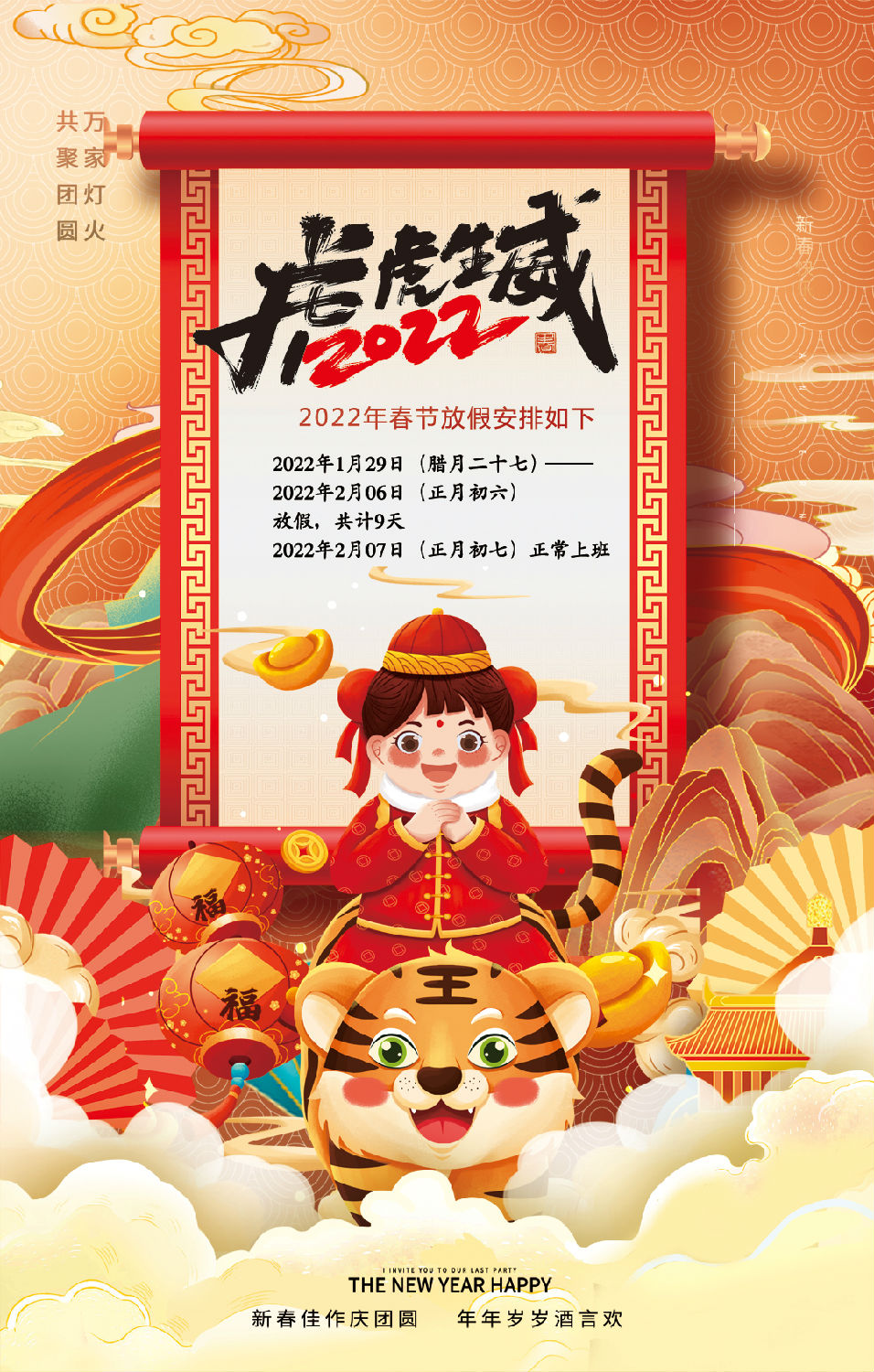 2022年1月29日(臘月二十七)~2022年2月06日(正月初六)放假,共計(jì)9天