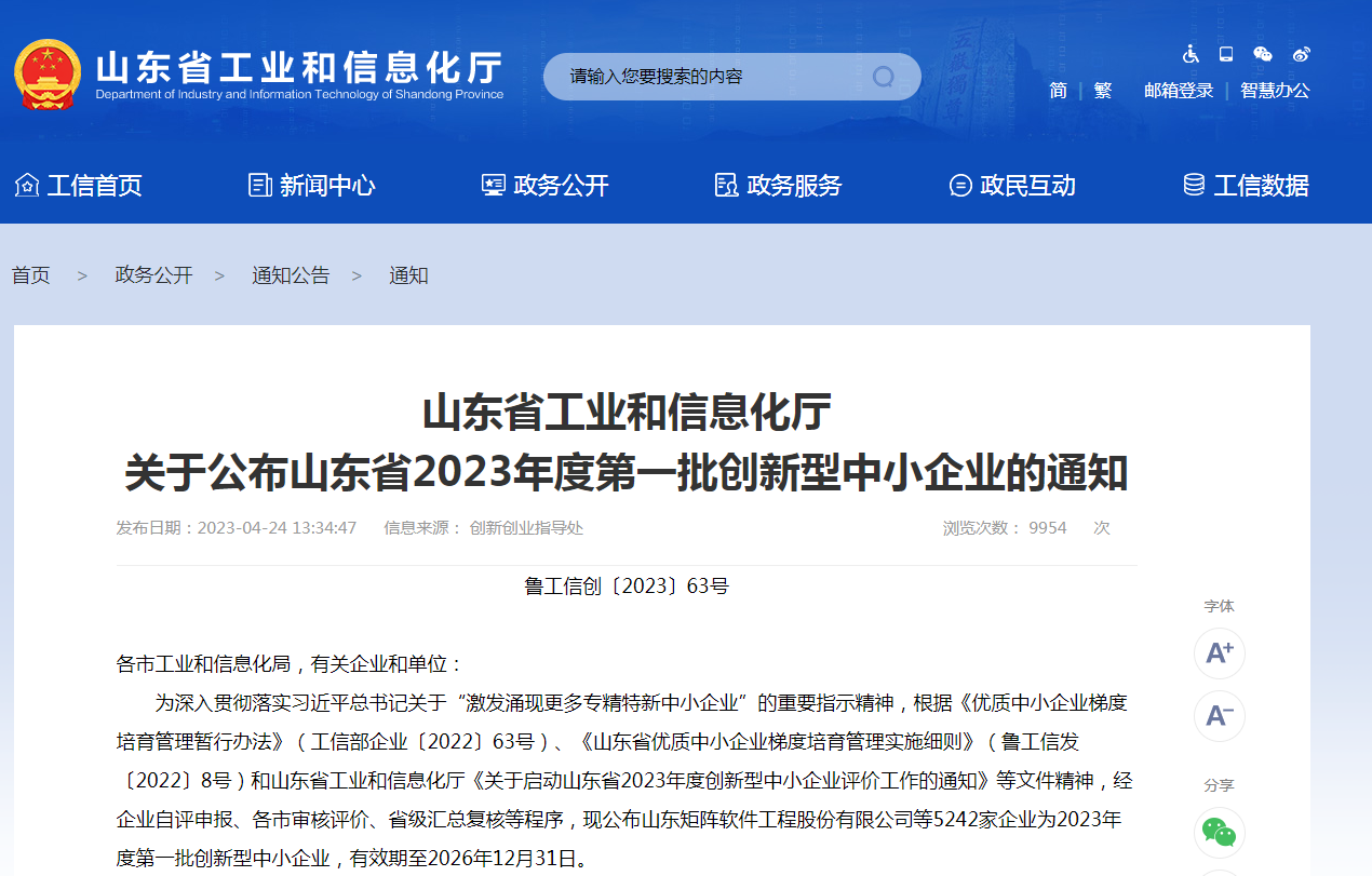 為深入貫徹落實(shí)習(xí)近平總書(shū)記關(guān)于“激發(fā)涌現(xiàn)更多專(zhuān)精特新中小企業(yè)”的重要指示精神,根據(jù)《優(yōu)質(zhì)中小企業(yè)梯度培育管理暫行辦法》(工信部企業(yè)〔2022〕63號(hào))、《山東省優(yōu)質(zhì)中小企業(yè)梯度培育管理實(shí)施細(xì)則》(魯工信發(fā)〔2022〕8號(hào))和山東省工業(yè)和信息化廳《關(guān)于啟動(dòng)山東省2023年度創(chuàng)新型中小企業(yè)評(píng)價(jià)工作的通知》等文件精神,經(jīng)企業(yè)自評(píng)申報(bào)、各市審核評(píng)價(jià)、省級(jí)匯總復(fù)核等程序,現(xiàn)公布山東矩陣軟件工程股份有限公司等5242家企業(yè)為2023年度第一批創(chuàng)新型中小企業(yè),有效期至2026年12月31日。